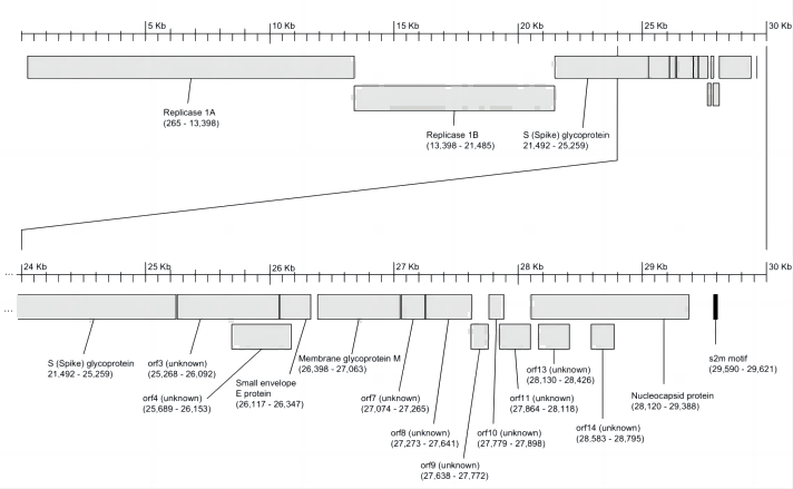 根據(jù)CDCWHO的介紹,針對SARS的核酸診斷一般是針對ORF1ab/RdRP(RNA-dependent RNA polymerase)、Gene N、Gene M和Gene E, Gene S更多用于對應藥物和疫苗的開發(fā)。NCBI收錄序列為NC_004718.3,全長29751bp,基因編碼4個結構蛋白:SM,NE。
