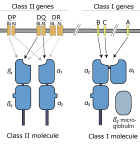 II類區(qū)域?qū)?yīng) HLA-DR、-DQ和 -DP基因等,編碼 α 鏈基因 (A1) 和 β 鏈基因 (B1)。α鏈和 β鏈配對形成功能性HLA分子。大多數(shù)個體攜帶額外的DRB基因 (DRB3 或 DRB4 或 DRB5),該基因編碼可能與α鏈配對的不同β鏈。
