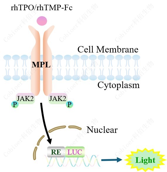 TPO Effector Reporter Cell 報(bào)告基因藥靶模型很好的模擬了體內(nèi) TPO 的信號(hào)轉(zhuǎn)導(dǎo)過程, 原理見下圖所示。![]() Figure 1. TPO Effector Reporter Cell 細(xì)胞模型原理圖 |