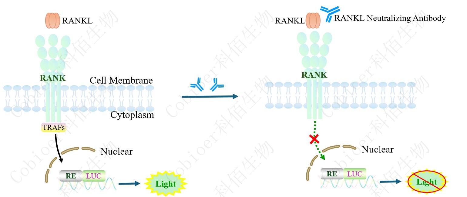 RANK Effector Reporter Cell 報(bào)告基因藥靶模型很好的模擬了體內(nèi) RANK 的信號(hào)轉(zhuǎn)導(dǎo)過(guò)程,原理見(jiàn)下圖所示。