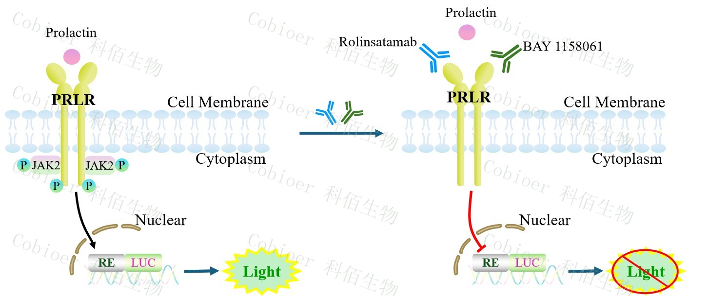 PRL Effector Reporter Cell 報(bào)告基因藥靶模型很好的模擬了體內(nèi) PRL 的信號(hào)轉(zhuǎn)導(dǎo)過(guò)程, 原理見(jiàn)下圖所示。![]() Figure 1. PRL Effector Reporter Cell 模型原理圖 |