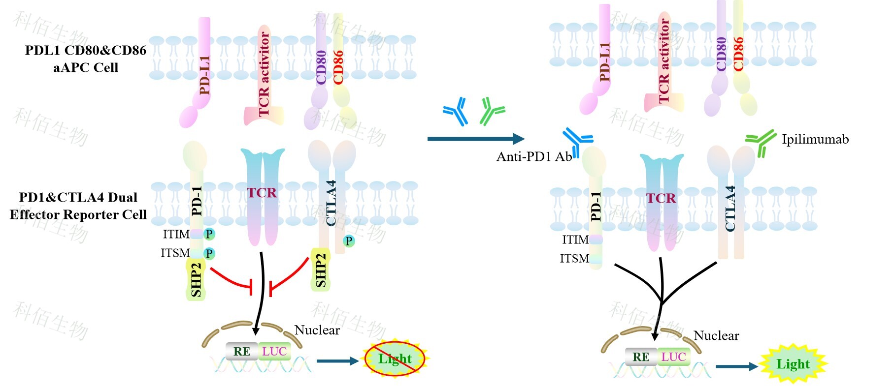 PDL1 CD80&CD86 aAPC Cell 作為 PD1&CTLA4 Dual Effector Reporter Cell 的靶細胞,很好的模擬了體內(nèi) PD1&CTLA4 的信號轉(zhuǎn)導過程,原理見下圖所示。