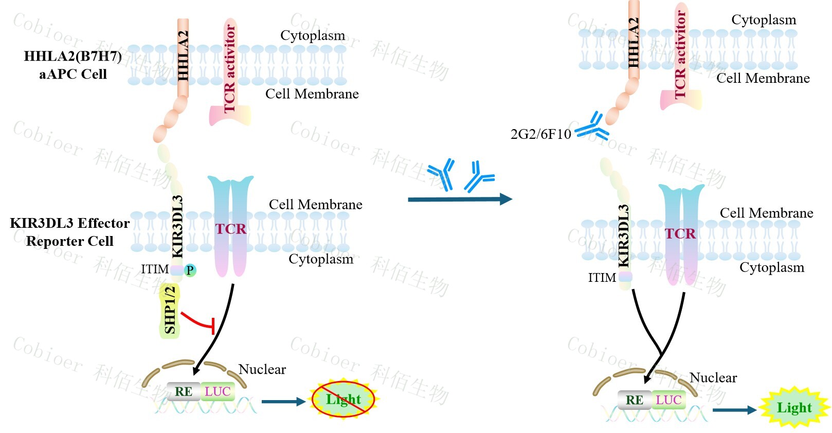HHLA2(B7H7) aAPC Cell 作為 KIR3DL3 Effector Reporter Cell 或 TMIGD2 Effector Reporter Cell 的靶細胞 , 很好的模擬了體內 KIR3DL3/ HHLA2(B7H7) 或TMIGD2/HHLA2(B7H7)的信號轉導過程,原理見下圖所示。![]() ![]() Figure 1. HHLA2(B7H7) aAPC Cell 細胞模型原理圖 |