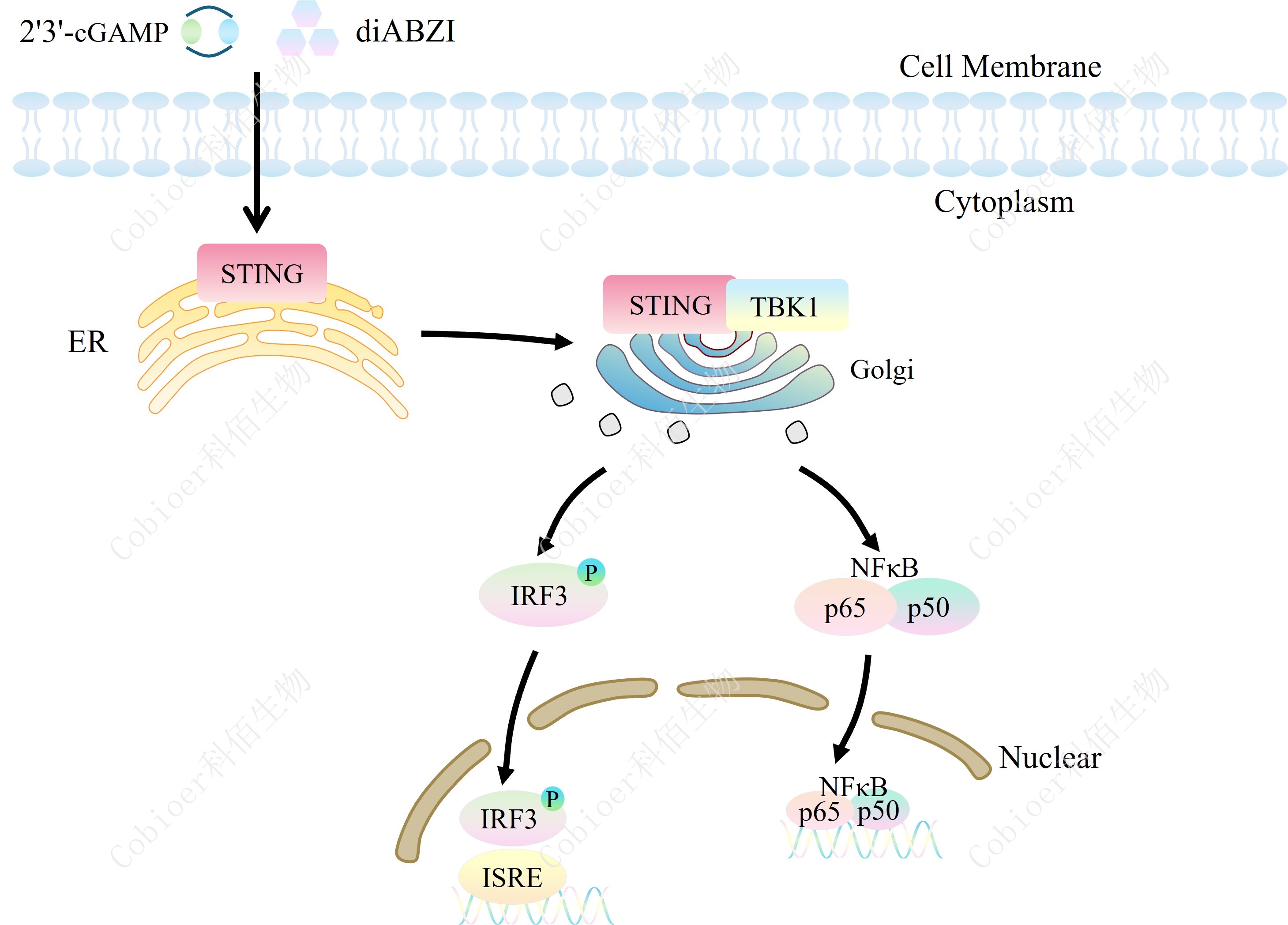| STING(干擾素基因刺激因子)又稱 MPYS、TMEM173、MITA 和 ERIS,是一種跨膜蛋白,是環(huán)狀二核苷酸(CDN)的直接傳感器。CDN 是細菌信號轉(zhuǎn)導(dǎo)中普遍存在的第二信使分子,是哺乳動物細胞的防御觸發(fā)器。當(dāng)細菌病原體攻擊時,釋放到細胞中的 CDN 直接與 STING 結(jié)合,激活的 STING 和 TANK 結(jié)合激酶-I (TBK1) 相互作用以誘導(dǎo)活性干擾素調(diào)節(jié)因子 (IRF3) 二聚體,然后該二聚體與細胞核中的干擾素刺激反應(yīng)元件 (ISRE) 結(jié)合并導(dǎo)致 IFN-α/β 的產(chǎn)生。IFNβ 的產(chǎn)生是 STING 活化的標(biāo)志。腫瘤微環(huán)境(TME)中由于天然免疫產(chǎn)生的信號傳導(dǎo)是導(dǎo)致腫瘤特異性 T 細胞激活和腫瘤浸潤性淋巴細胞(TIL)浸潤的關(guān)鍵因素。其中尤其以 I 型 IFN 對腫瘤特異性 T 細胞的活化最為關(guān)鍵。因此,STING 激動劑可以通過誘導(dǎo)Ⅰ型干擾素基因的表達,激活包括樹突狀細胞等免疫刺激細胞,改變腫瘤微環(huán)境并誘導(dǎo)腫瘤特異性 T 細胞的產(chǎn)生,從而通過調(diào)節(jié)免疫系統(tǒng)達到抗腫瘤的目的。 | |