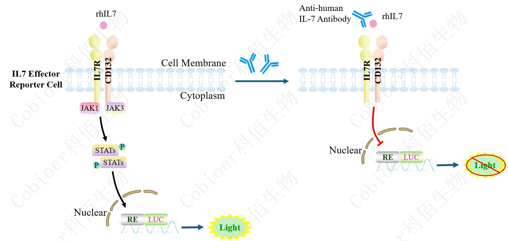 IL7 Effector Reporter Cell 報(bào)告基因藥靶模型很好的模擬了體內(nèi) IL7 的信號(hào)轉(zhuǎn)導(dǎo)過(guò)程,原理見(jiàn)下圖所示。