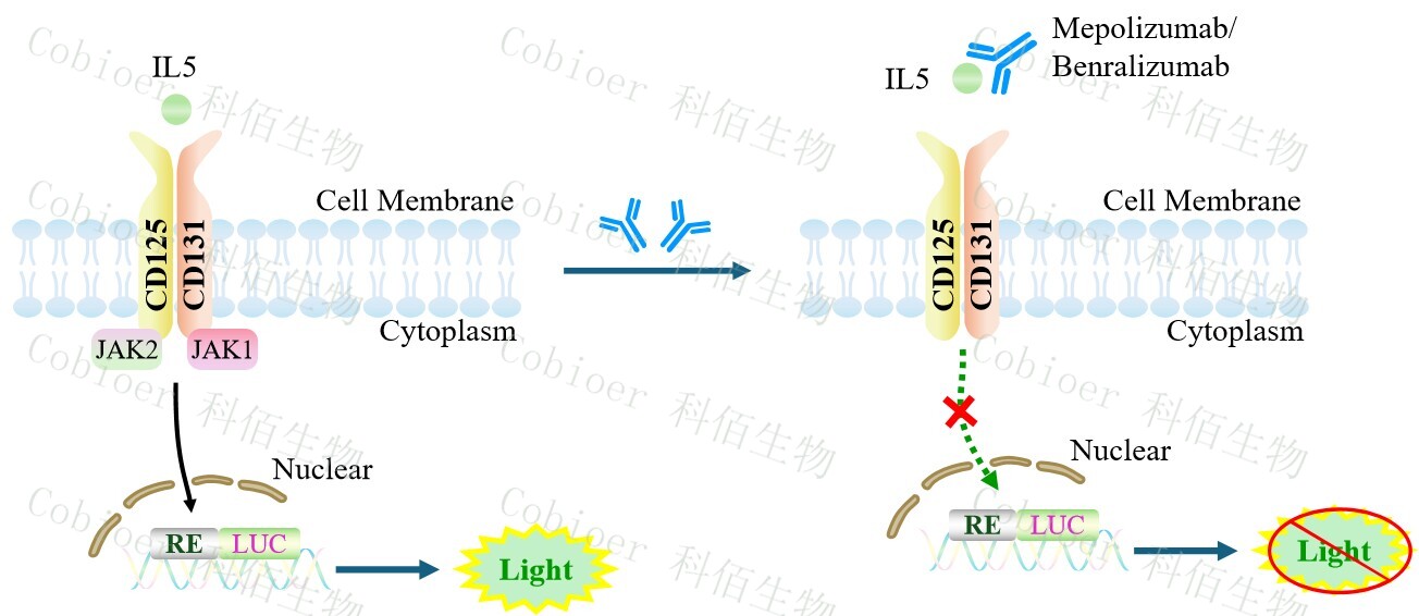 IL5 Effector Reporter Cell 報(bào)告基因藥靶模型很好的模擬了體內(nèi) IL5 的信號(hào)轉(zhuǎn)導(dǎo)過程, 原理見下圖所示。