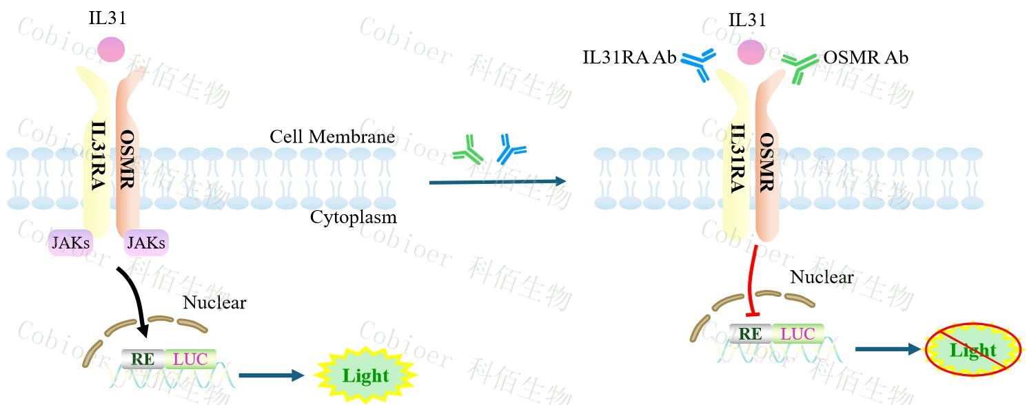IL31 Effector Reporter報告基因藥靶模型很好的模擬了體內(nèi) IL31的信號轉(zhuǎn)導過程,原理見下圖所示。