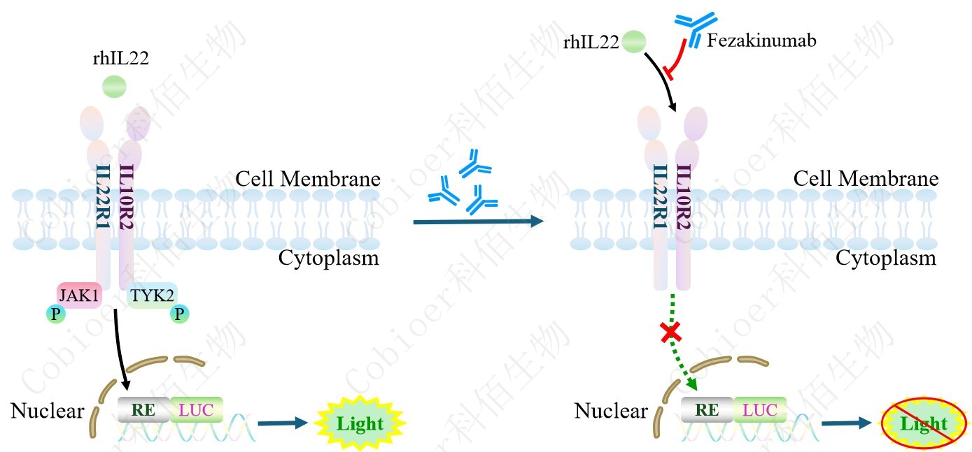 IL22 Effector Reporter Cell 報(bào)告基因藥靶模型很好的模擬了體內(nèi) IL22 的信號(hào)轉(zhuǎn)導(dǎo)過程, 原理見下圖所示。![]() Figure 1. IL22 Effector Reporter Cell 細(xì)胞模型原理圖 |
