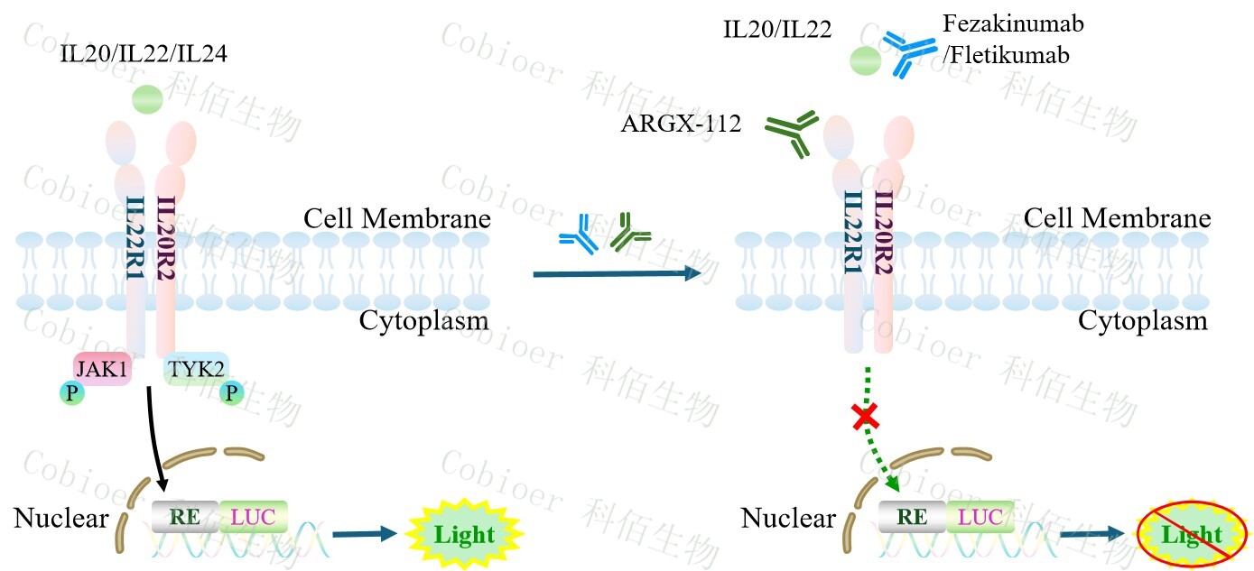 hIL20/IL22/IL24 Triple Effector Reporter Cell 報(bào)告基因藥靶模型很好的模擬了體內(nèi)IL20/IL22/IL24 的信號(hào)轉(zhuǎn)導(dǎo)過程,原理見下圖所示。