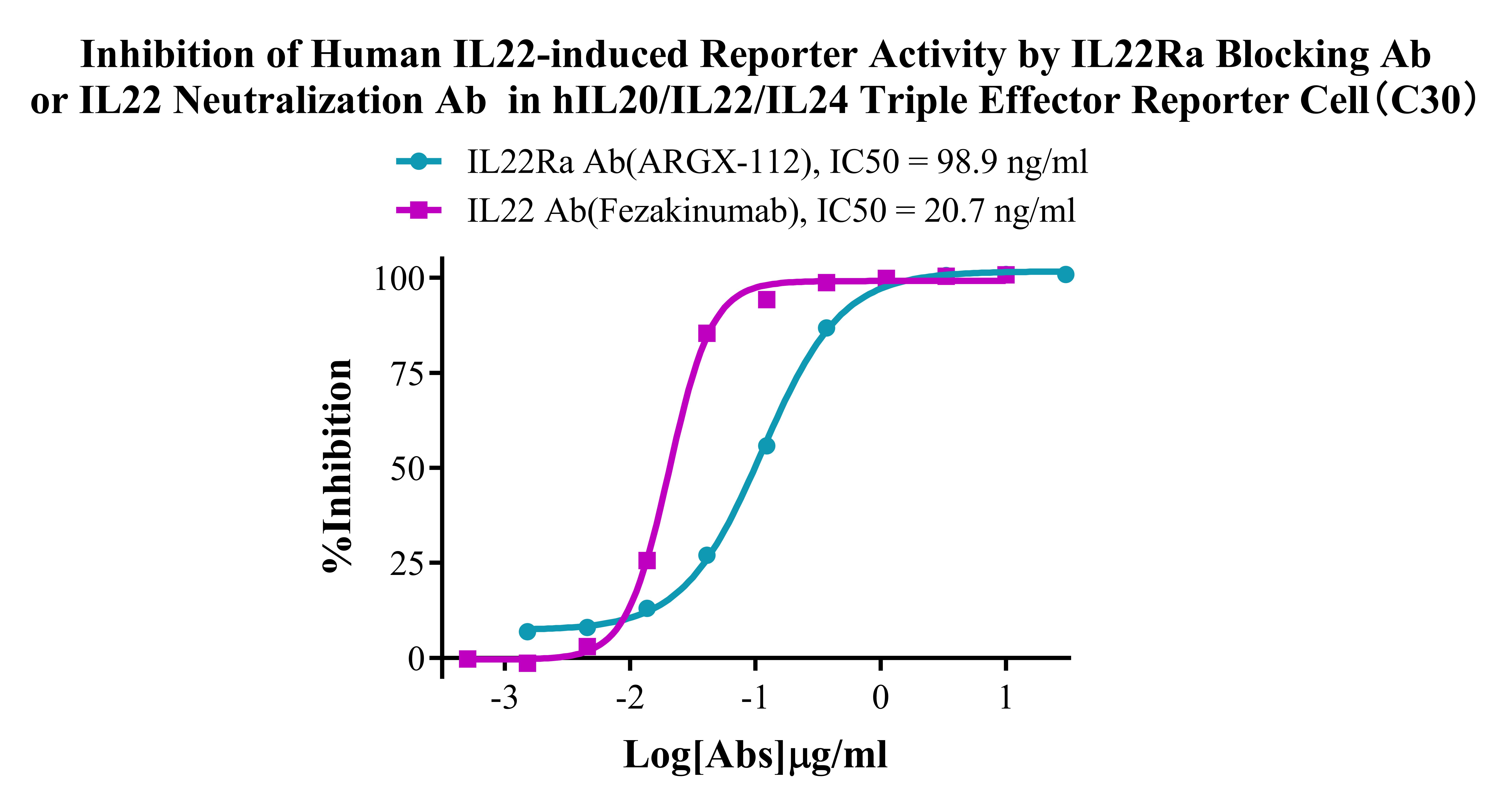 Figure 4. Inhibition of Human IL22-induced Reporter Activity by IL22Ra Blocking Ab or IL22 Neutralization Ab in hIL20/IL22/IL24 Triple Effector Reporter Cell(C30).