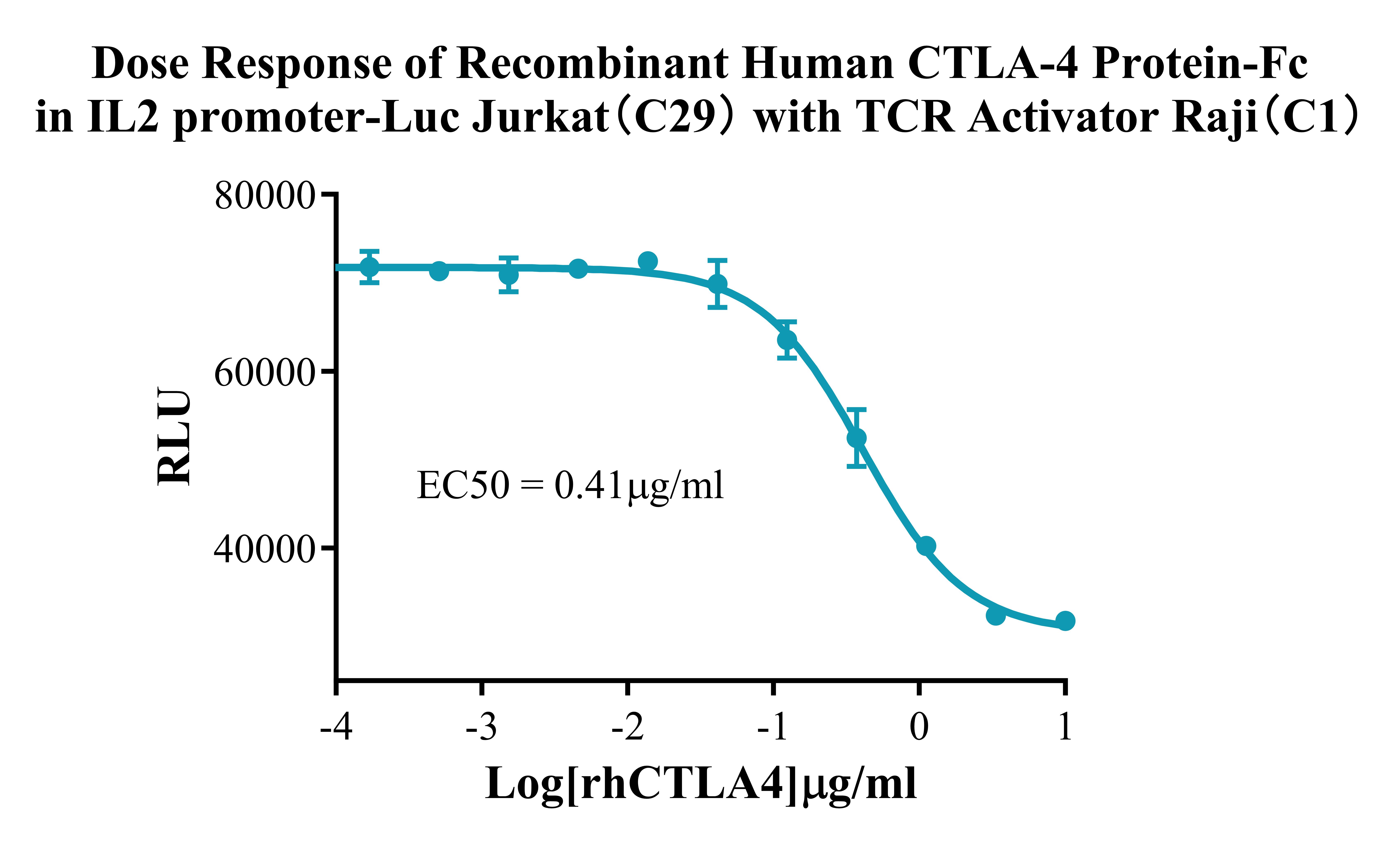Figure 4. Detect Luciferase assay by Ultra Luciferase Detection Kit CBPH0001(we strongly suggest to purchase from Cobioer). Dose Response of Recombinant Human CTLA-4 Protein-Fc in IL2 Promoter-Luc Jurkat(C29) with TCR Activitor Raji (C1).