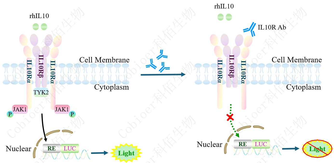 IL10 Effector Reporter Cell 報(bào)告基因藥靶模型很好的模擬了體內(nèi) IL10 的信號轉(zhuǎn)導(dǎo)過程, 原理見下圖所示。![]() Figure 1. IL10 Effector Reporter Cell 細(xì)胞模型原理圖
