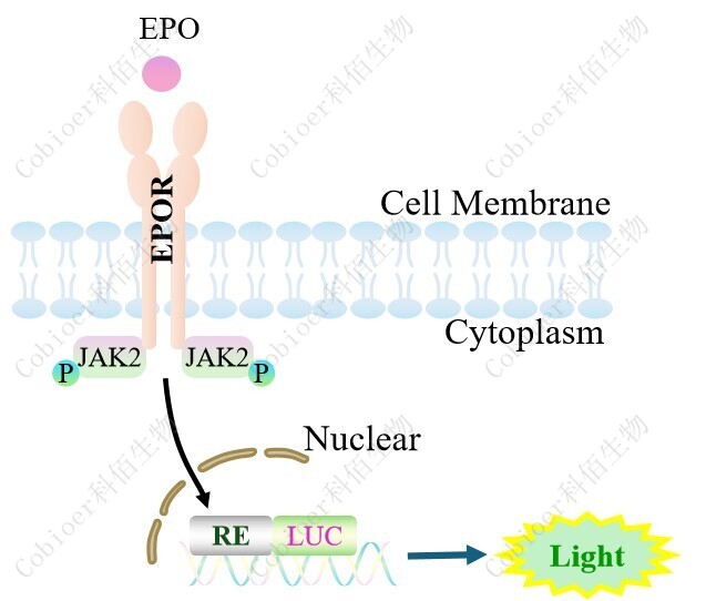 EPO Effector Reporter Cell 報告基因藥靶模型很好的模擬了體內(nèi) EPO&EPOR 的信號轉(zhuǎn) 導(dǎo)過程,原理見下圖所示。