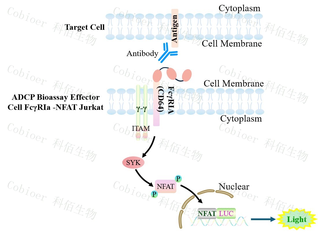 ADCP Bioassay Effector Cell FcγRIa -NFAT Jurkat 報(bào)告基因藥靶模型很好的模擬了體內(nèi) ADCP 的信號(hào)轉(zhuǎn)導(dǎo)過(guò)程,原理見(jiàn)下圖所示。