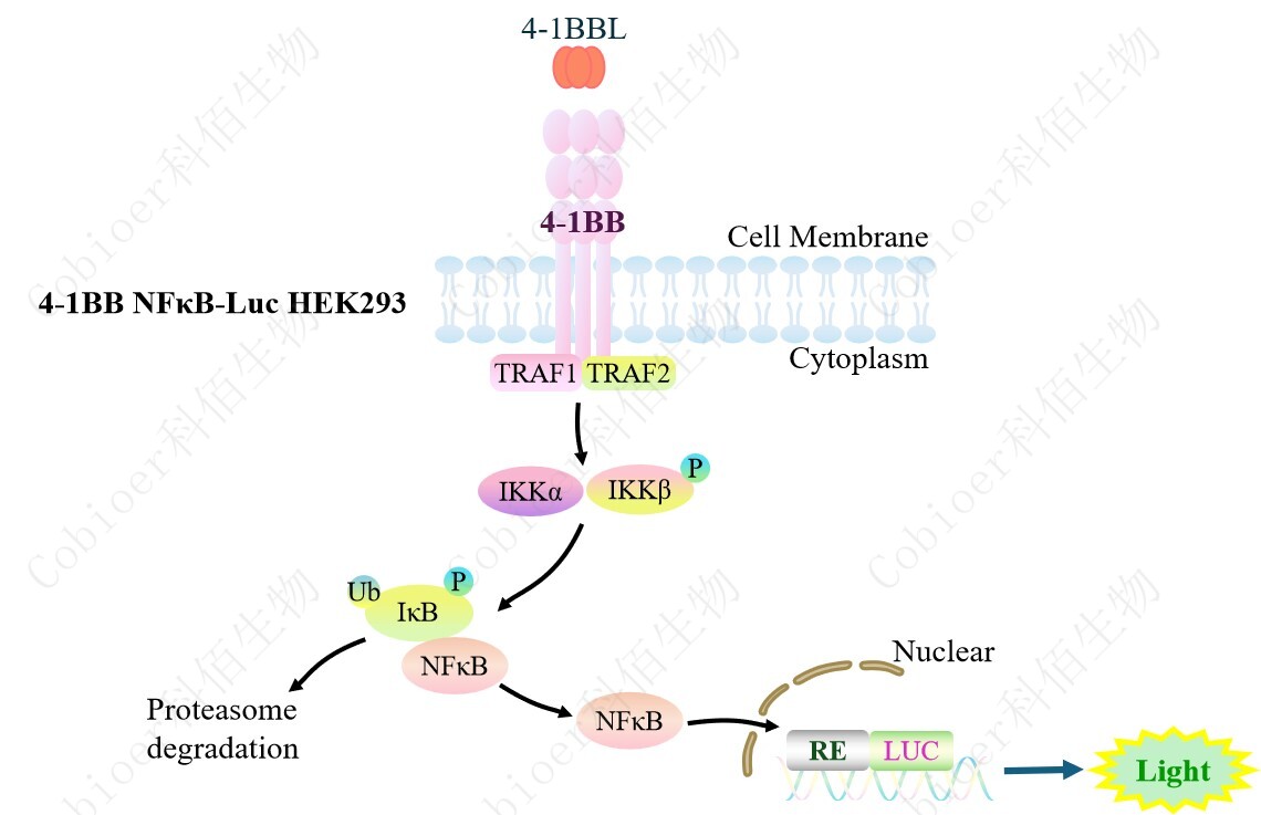 4-1BB NFκB-Luc HEK293 報(bào)告基因藥靶模型很好的模擬了體內(nèi) 4-1BB 的信號(hào)轉(zhuǎn)導(dǎo)過(guò)程, 原理見(jiàn)下圖所示。