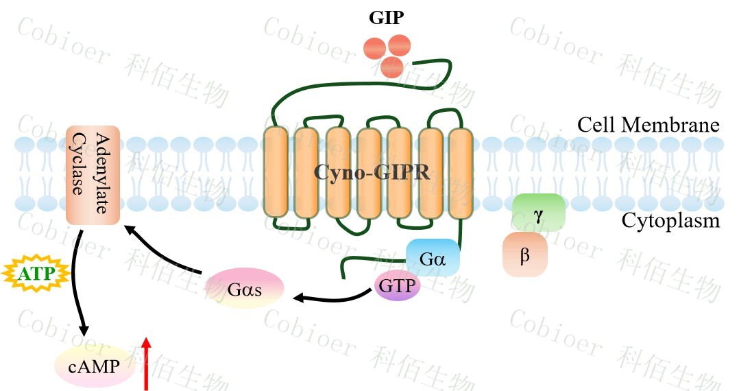 cAMP 在 G 蛋白偶聯(lián)受體(GPCR)信號(hào)轉(zhuǎn)導(dǎo)中是一種關(guān)鍵的第二信使。當(dāng)配體結(jié)合到 GPCR,構(gòu)象發(fā)生變化,激活受體接著激活G蛋白,Gs的激活導(dǎo)致腺苷酸環(huán)化酶調(diào)控cAMP 的升高。GIPR 藥靶模型很好的模擬了體內(nèi) GIPR 的信號(hào)轉(zhuǎn)導(dǎo)過(guò)程,原理見(jiàn)下圖所示。