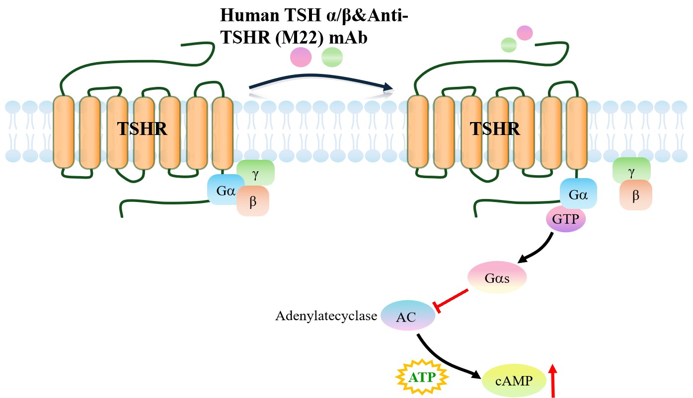 cAMP 在 G 蛋白偶聯(lián)受體(GPCR)信號轉導中是一種關鍵的第二信使。當配體結合 到 GPCR,構象發(fā)生變化,激活受體接著激活 G 蛋白,Gs 的激活導致腺苷酸環(huán)化酶調(diào)控 cAMP 的升高。TSHR 藥靶模型很好的模擬了體內(nèi) TSHR 的信號轉導過程,原理見下圖所示。 |