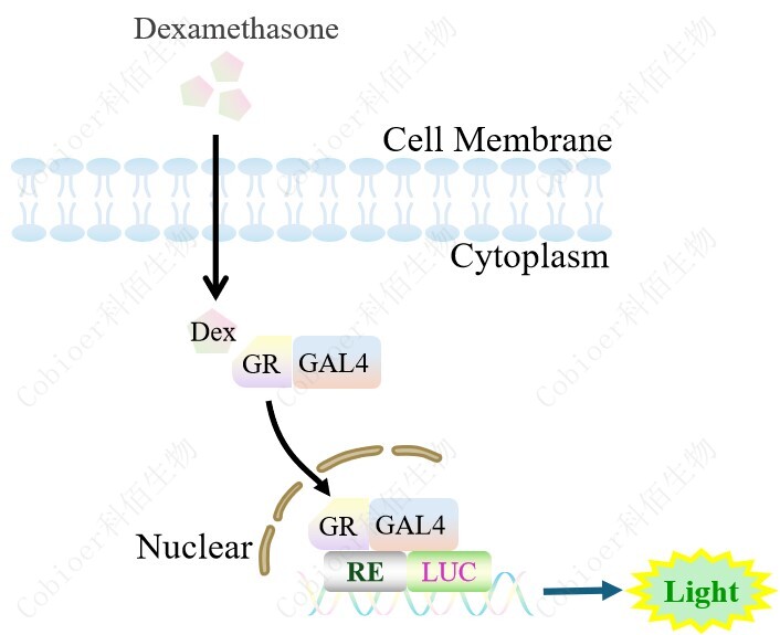 由 GR-GAL4 調 控并表達 Luc 熒光素酶報告基因的 HEK293 細胞。Dexamethasone (Hexadecadrol,地塞米 松)是糖皮質激素受體 (Glucocorticoid Receptor)激動劑、凋亡誘導劑,原理見下圖所示。