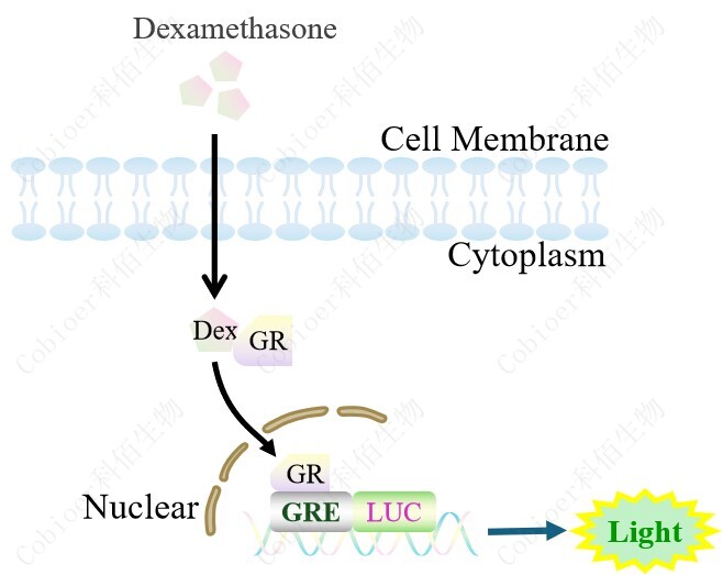 GRE-Luc A549 報告基因細胞,是由 GRE 調控并表達 Luc 熒光素酶報告 基 因的 A549 細 胞。 Dexamethasone (Hexadecadrol, 地 塞米 松)是 糖皮質激素受體 (Glucocorticoid Receptor)激動劑、凋亡誘導劑,原理見下圖所示。![]() Figure 1. GRE-Luc A549 細胞原理示意圖 |
