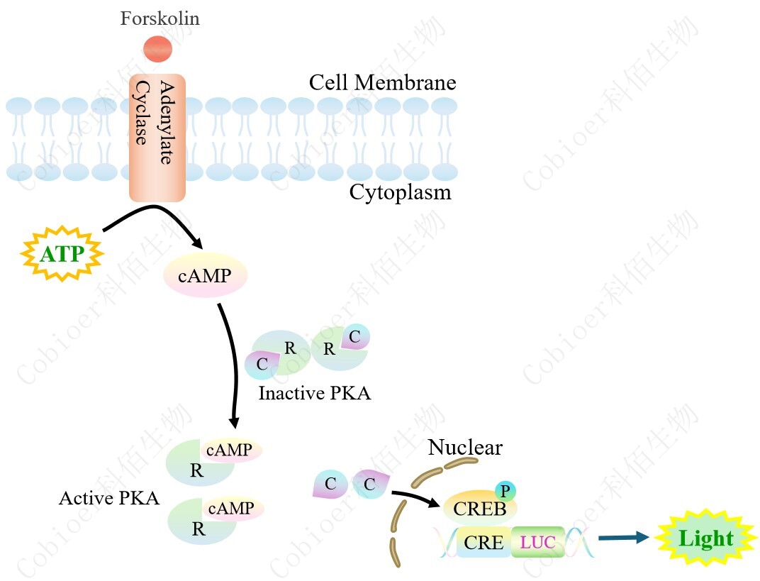 CRE-Luc CHO 報告基因細胞,是由 CRE 調(diào)控并表達 Luc 熒光素酶報告 基因的 CHO 細胞。Forskolin 是天然存在的直接腺苷酸環(huán)化酶(AC)/cAMP/CREB 的激活 劑,原理見下圖所示。