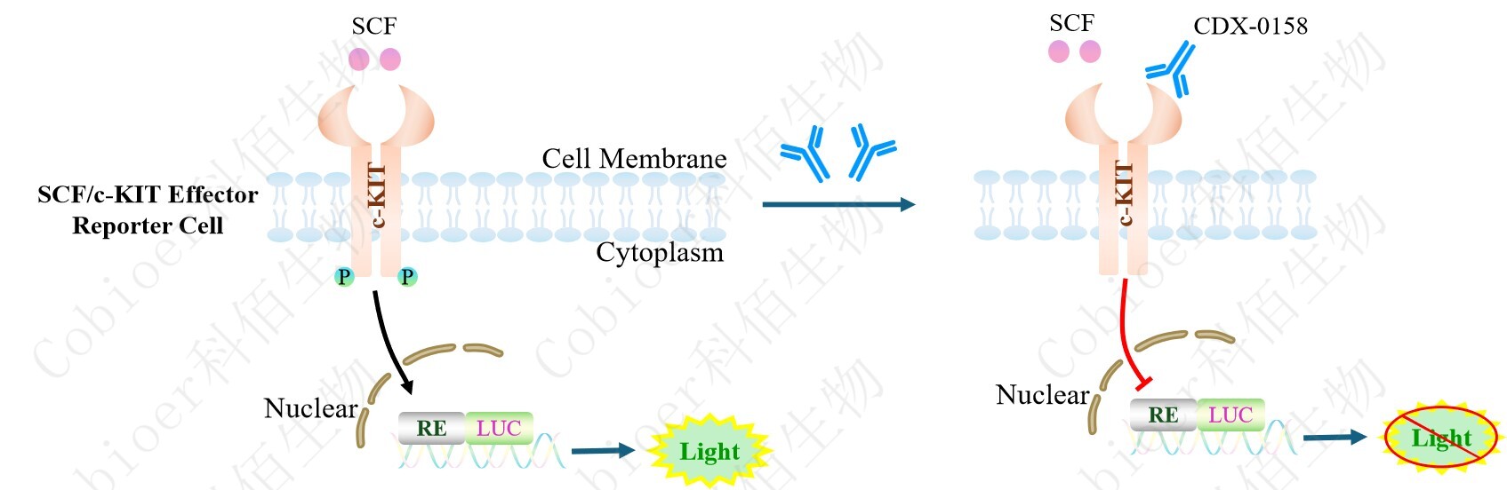 SCF/c-KIT Effector Reporter Cell 報(bào)告基因藥靶模型很好的模擬了體內(nèi) SCF/c-KIT 的信號轉(zhuǎn)導(dǎo)過程,原理見下圖所示。