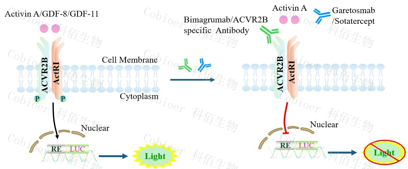 ACVR2B Effector Reporter Cell 報(bào)告基因藥靶模型很好的模擬了體內(nèi) ACVR2A 的信號轉(zhuǎn)導(dǎo)過程,原理見圖 所示。