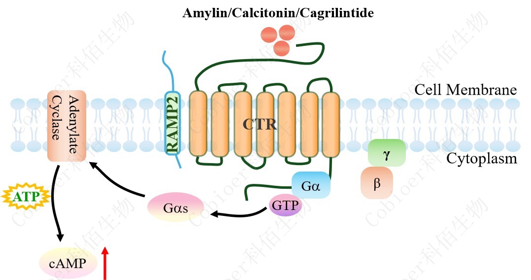 胰淀素(Amylin)受體的三種類型的已被確定,即 AMY1,AMY2 和 AMY3。胰淀素 受體屬于 B 類 GPCR,是異二聚體復(fù)合物,由降鈣素受體(CTR)與受體活性修飾蛋白 (RAMPs)結(jié)合形成。該受體的 CTR 組分具有相同的 GPCR 結(jié)構(gòu):7 個(gè)跨膜相互連接的α- 螺旋,將細(xì)胞外信號(hào)傳遞到細(xì)胞內(nèi)細(xì)胞質(zhì)信號(hào)級(jí)聯(lián)。RAMP 有三種類型(RAMP1、 RAMP2 和 RAMP3),它們共享 31%的氨基酸序列,具有相似的基本結(jié)構(gòu)。RAMP 是將 CTR 轉(zhuǎn)運(yùn)到細(xì)胞膜并調(diào)節(jié)其配體特異性的重要肽,它可以改變特定 GPCR 的藥理學(xué)、功能 和細(xì)胞運(yùn)輸。