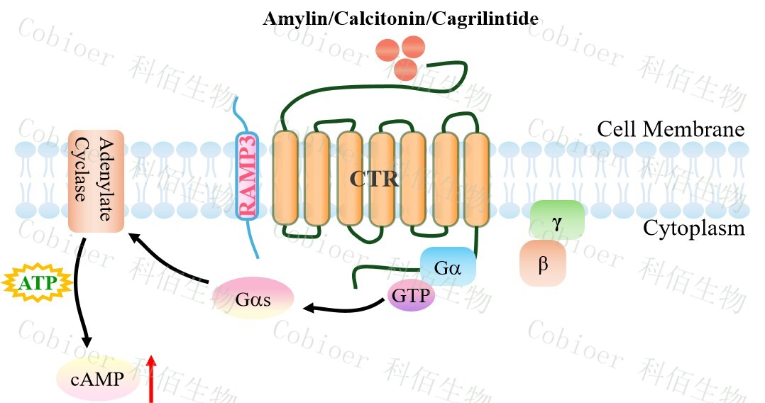 胰淀素(Amylin)受體的三種類型的已被確定,即 AMY1,AMY2 和 AMY3。胰淀素 受體屬于 B 類 GPCR,是異二聚體復(fù)合物,由降鈣素受體(CTR)與受體活性修飾蛋白 (RAMPs)結(jié)合形成。該受體的 CTR 組分具有相同的 GPCR 結(jié)構(gòu):7 個(gè)跨膜相互連接的α- 螺旋,將細(xì)胞外信號(hào)傳遞到細(xì)胞內(nèi)細(xì)胞質(zhì)信號(hào)級(jí)聯(lián)。RAMP 有三種類型(RAMP1、 RAMP2 和 RAMP3),它們共享 31%的氨基酸序列,具有相似的基本結(jié)構(gòu)。RAMP 是將 CTR 轉(zhuǎn)運(yùn)到細(xì)胞膜并調(diào)節(jié)其配體特異性的重要肽,它可以改變特定 GPCR 的藥理學(xué)、功能 和細(xì)胞運(yùn)輸。