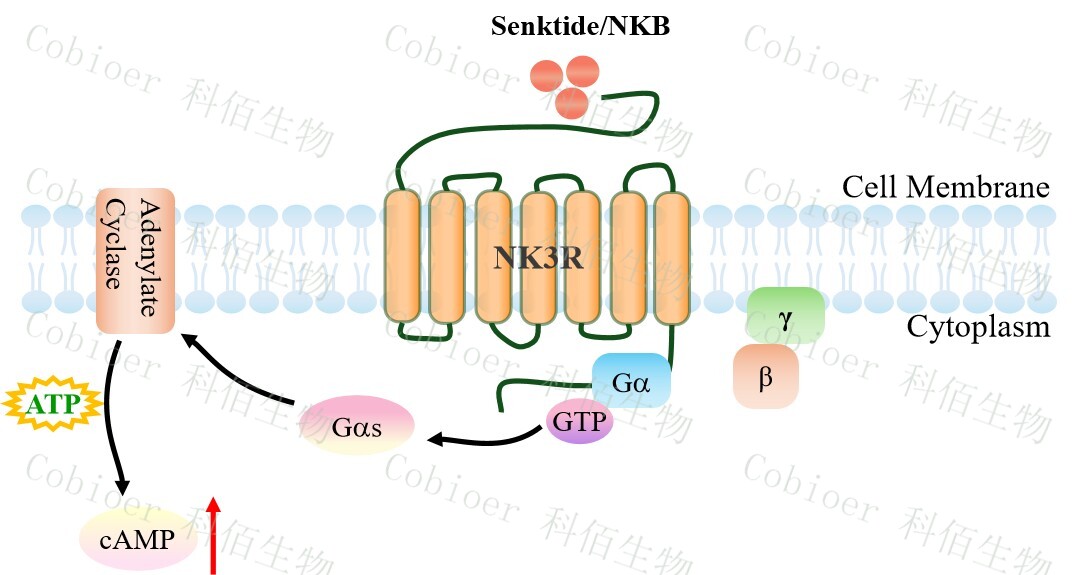 | 速激肽(Tachykinin)是在整個神經(jīng)和免疫系統(tǒng)中表達的神經(jīng)肽,作為興奮性神經(jīng)遞質(zhì), 它們在調(diào)節(jié)各種生理功能中發(fā)揮重要的作用。在不同的速激肽中,P 物質(zhì)(SP)、神經(jīng)激 肽 A(NKA) 和 NKB 已得到充分研究。這些肽可以通過三種不同的 GPCR、神經(jīng)激肽 1 受體(NK1R)、神經(jīng)激肽 2 受體(NK2R) 和 NK3R 發(fā)揮作用。作為具有不同親和力的 完全激動劑。 NK3R(Neurokinin 3 Receptor),又稱 TACR3,是速激肽受體家族的重要成員,屬于 GPCR 超家族。其內(nèi)源性配體為神經(jīng)激肽 B(Neurokinin B, NKB),通過激活下游信號通 路參與生殖調(diào)控、神經(jīng)內(nèi)分泌調(diào)節(jié)及多種疾病進程。近年來,NK3R 成為治療更年期癥狀、 神經(jīng)精神疾病及癌癥的熱門靶點。 |