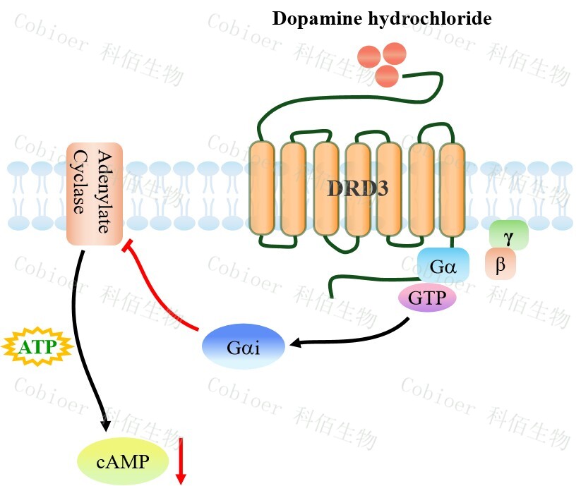 多巴胺(DA)是一種主要的兒茶酚胺神經(jīng)遞質(zhì),它與多巴胺受體(DRs)結(jié)合,因此 在中樞神經(jīng)系統(tǒng)(CNS)中起著重要作用,包括睡眠、工作記憶、情緒、學(xué)習(xí)等。DRs 是 由 DRD1、DRD2、DRD3、DRD4 和 DRD5 組成的 G 蛋白偶聯(lián)受體,根據(jù)它們對腺苷酸環(huán) 化酶(AC)活性的不同調(diào)節(jié)作用,分為 D1 樣受體(DRD1 和 DRD5)和 D2 樣受體(DRD 2、DRD3 和 DRD4)。 D2 樣受體與 Go 和 Gi 蛋白偶聯(lián),它們參與 AC 的失活,導(dǎo)致胞質(zhì)內(nèi) cAMP 水平降低。 DA 與 D2 樣受體的結(jié)合抑制 cAMP/PKA 信號通路,最終影響 CREB 磷酸化。DRD3 主要分 布于中樞神經(jīng)系統(tǒng)的邊緣區(qū)域,調(diào)控情緒及運(yùn)動(dòng)功能,是精神分裂癥、藥物成癮及帕金森 病的重要治療靶點(diǎn)。