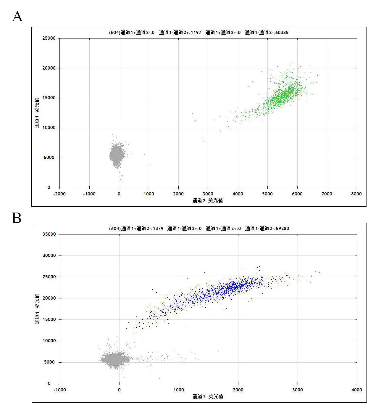 MCF7 通道 2 藍(lán)色微滴代表 ESR1[D538G]突變陽性,通道 2 綠色微滴代表該位點(diǎn)為陰性野生型