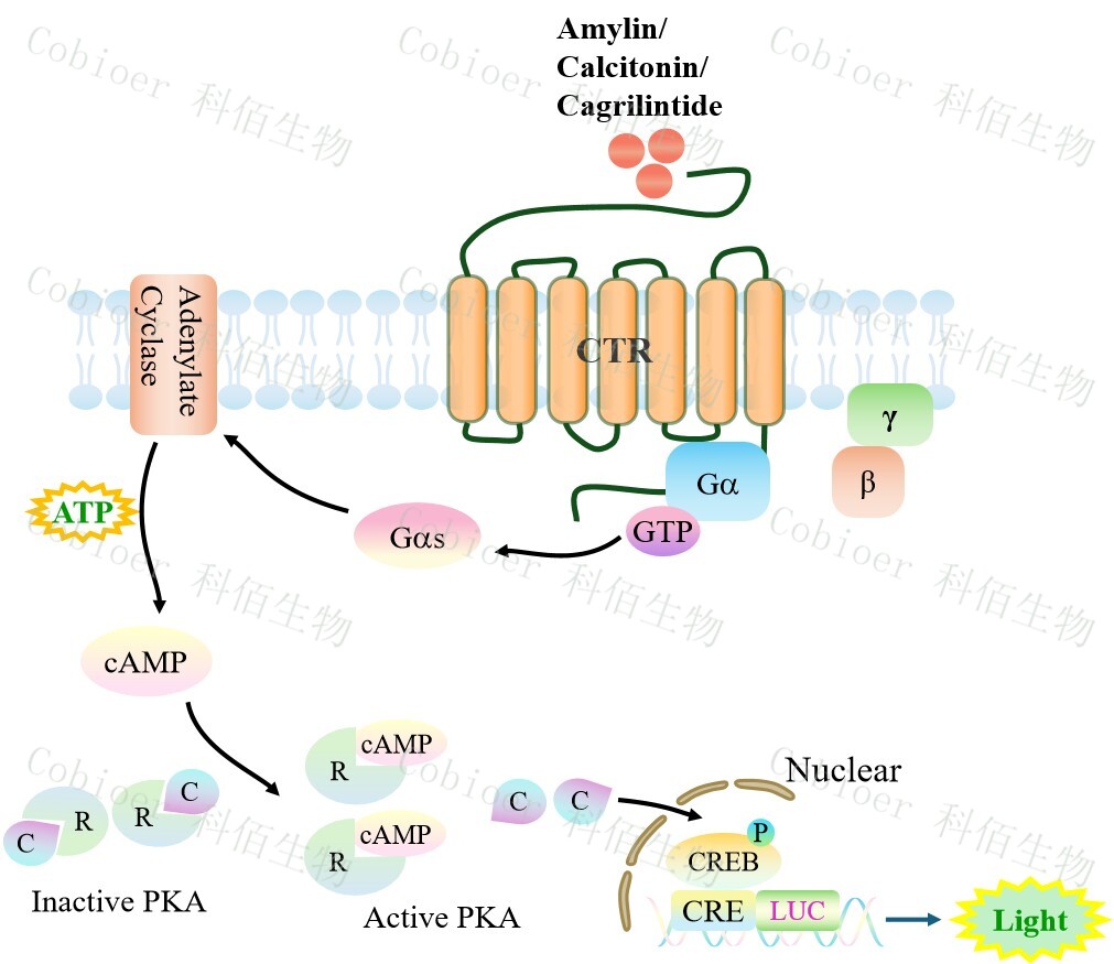 CTR CRE-Luc CHO 報告基因藥靶模型很好的模擬了體內(nèi) CTR 的信號轉(zhuǎn)導(dǎo)過程,原理見下圖所示。![]() Figure 1. CTR CRE-Luc CHO 細(xì)胞模型原理圖 |