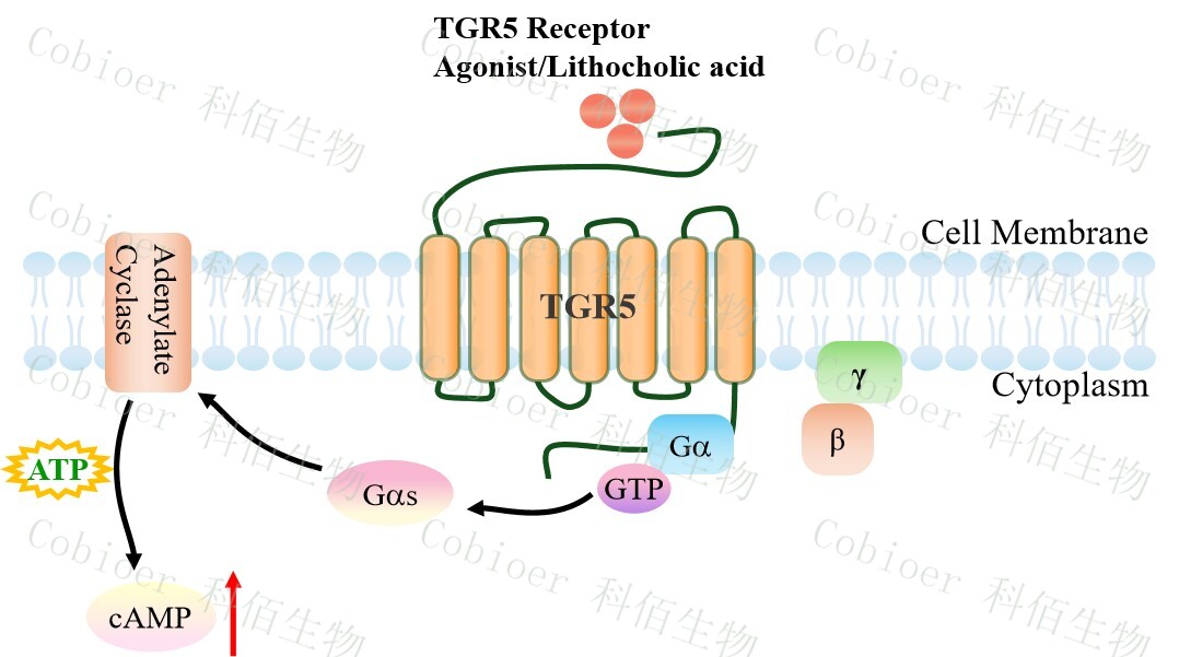 | TGR5 受體是第一個(gè)已知的膽汁酸特異性 G 蛋白偶聯(lián)受體,也被稱為膽汁酸受體 1(GPBAR1),屬于 A 類 GPCR 亞家族。該受體由七個(gè)跨膜螺旋(TMH1-7)、三個(gè)胞外環(huán) (ECL1-3)組成,有助于配體結(jié)合,以及三個(gè)胞內(nèi)環(huán)(ICL1-3),參與將信號(hào)傳遞給下游 信號(hào)分子。TGR5 在體內(nèi)廣泛存在,在膽囊、回腸、結(jié)腸、棕色脂肪組織、脾臟、肺、骨 骼肌、胰島,肝臟中均有表達(dá)。有文獻(xiàn)報(bào)道 TGR5 被認(rèn)為是治療代謝性疾?。ㄈ?2 型糖尿 病)的潛在靶點(diǎn)。此外,TGR5 還能降低單核細(xì)胞中促炎細(xì)胞因子的水平,在炎癥過程 (包括結(jié)腸炎和動(dòng)脈粥樣硬化)中發(fā)揮核心作用的病理調(diào)節(jié)。 | |