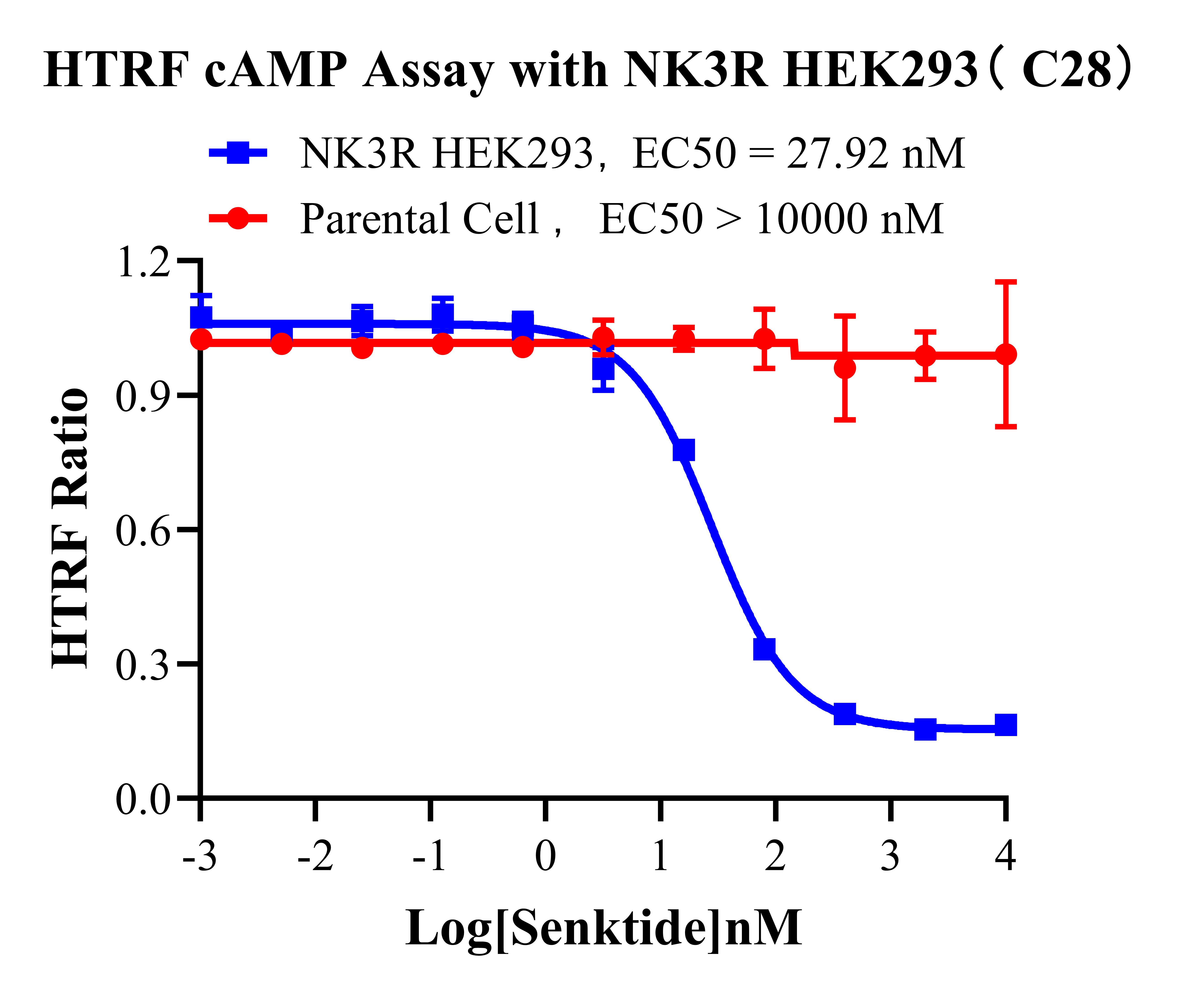 cAMP 在 G 蛋白偶聯(lián)受體(GPCR)信號轉導中是一種關鍵的第二信使。當配體結合 到 GPCR,構象發(fā)生變化,激活受體接著激活 G 蛋白,Gs 的激活導致腺苷酸環(huán)化酶調控 cAMP 的升高。NK3R HEK293 細胞藥靶模型很好的模擬了體內 NK3R 的信號轉導過程,原 理見下圖所示。