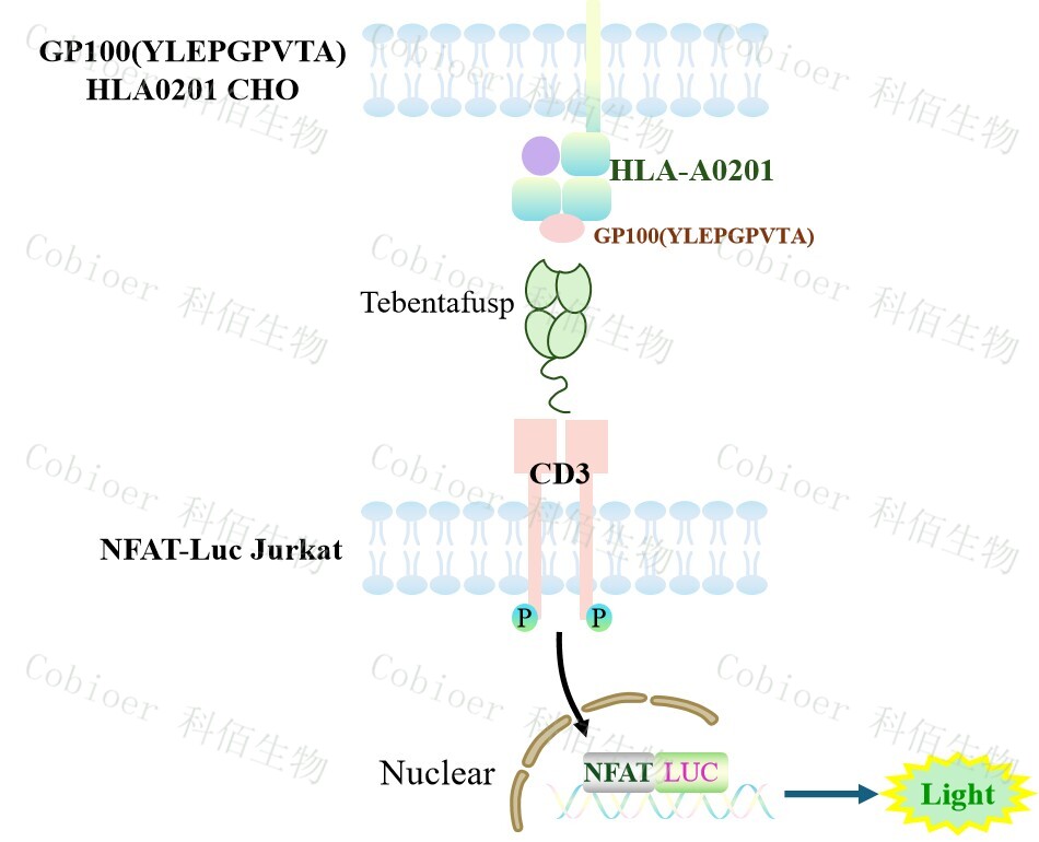 HLA-A*0201-GP100 復合物是人類白細胞抗原(HLA)Ⅰ類分子與 GP100 抗原肽的復 合體,屬于主要組織相容性復合體(MHC)Ⅰ類家族成員。該復合物常用于 T 細胞受體 (TCR)療法,通過激活 T 細胞以識別并殺傷腫瘤細胞,原理見下圖所示。
