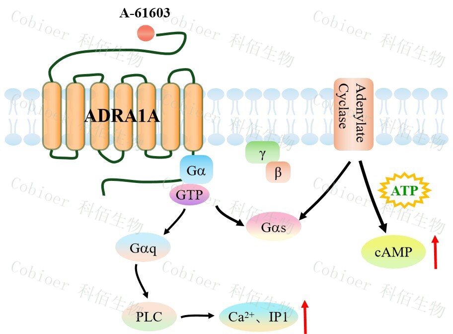 ADRA1A 還可以通過 Gq 蛋白的信號通路,調(diào)控 IP1 的升高。ADRA1A 與配體結(jié)合, 導(dǎo)致 Gαq 亞基的激活,觸發(fā) PLC-γ,從而產(chǎn)生兩個第二信使:IP3 和 DAG,它們參與細(xì)胞內(nèi)鈣動員。由于 IP3 在代謝上不穩(wěn)定,因此測量通路激活的替代標(biāo)志物 IP1 作為檢測標(biāo)準(zhǔn)。
