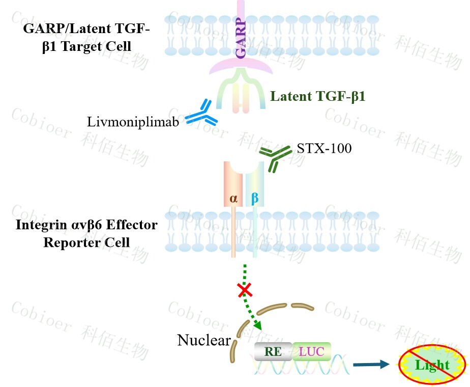 GARP/Latent TGF-β1 Target Cell 作為 Integrin αvβ6 Effector Reporter Cell 的靶細(xì)胞,藥 靶模型很好的模擬了體內(nèi) Integrin&GARP/Latent TGF-β1 的信號轉(zhuǎn)導(dǎo)過程,原理見下圖所示。![]() Figure 1. GARP/Latent TGF-β1 Target Cell 細(xì)胞模型圖 |