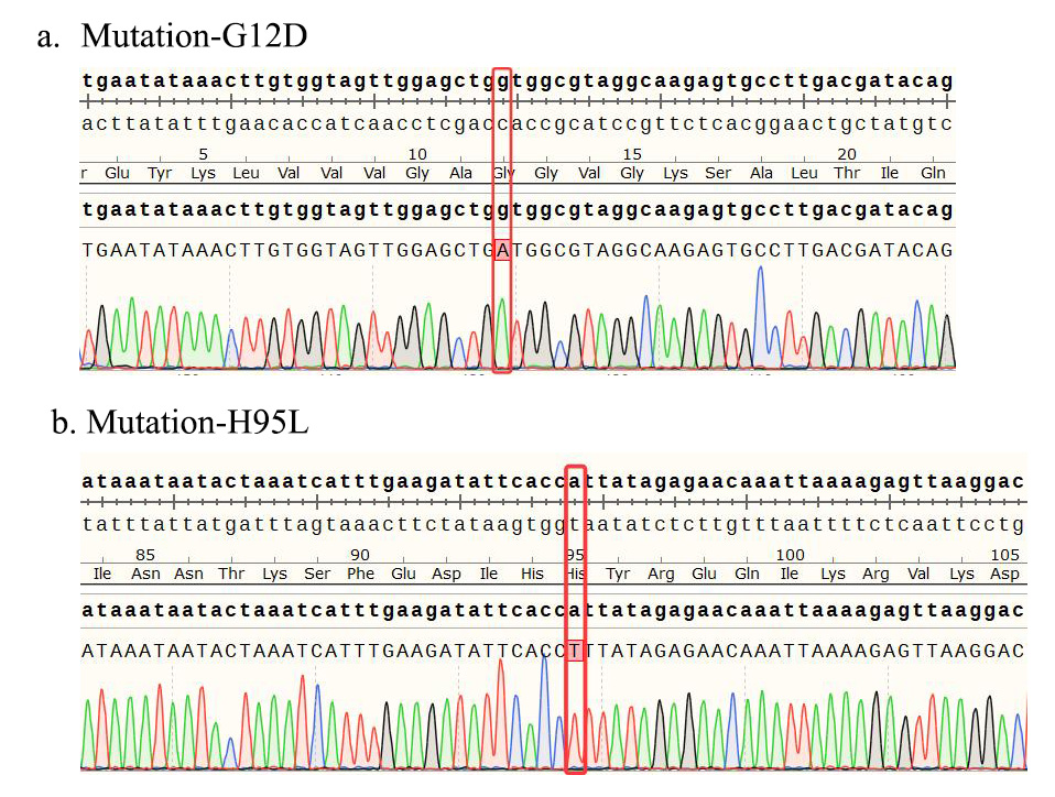 1.WB of KRAS [G12D&H95L] BaF3 Figure 2. WB of KRAS [G12D&H95L] BaF3 2.Sanger of KRAS [G12D&H95L] BaF3 |