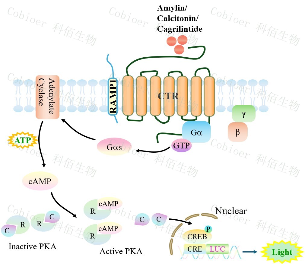 CTR&RAMP1 CRE-Luc CHO 報告基因藥靶模型很好的模擬了體內(nèi) CTR&RAMP1 的信號轉(zhuǎn)導(dǎo)過程,原理見下圖所示。
