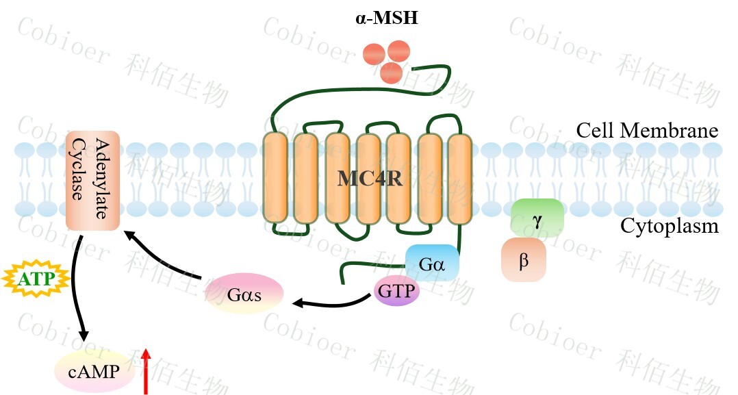 黑皮質(zhì)素 4 受體(MC4R)是黑皮質(zhì)素受體家族成員之一,其家族成員還包括:MC1R、 MC2R、MC3R 和 MC5R。該家族也是 GPCR 超家族中具有重大治療前景的一個(gè)亞家族, 屬于視紫紅質(zhì)樣 A 類 GPCR。MC4R 主要分布于下丘腦室旁核、杏仁核等食欲與能量平衡 調(diào)控中樞,其內(nèi)源性激動(dòng)配體為α-黑素細(xì)胞刺激素(α-MSH),拮抗配體為刺豚鼠相關(guān)蛋 白(AgRP);該受體通過(guò)偶聯(lián) Gs 蛋白激活腺苷酸環(huán)化酶,引起 cAMP 升高,從而啟動(dòng) PKA/CREB 信號(hào)通路,并介導(dǎo)β-arrestin 依賴的 MAPK 活化,核心功能為抑制食欲、促進(jìn)能 量消耗,其功能喪失性突變直接導(dǎo)致單基因肥胖、胰島素抵抗及代謝綜合征,而功能獲得 性突變則與反常的瘦表型相關(guān)。
