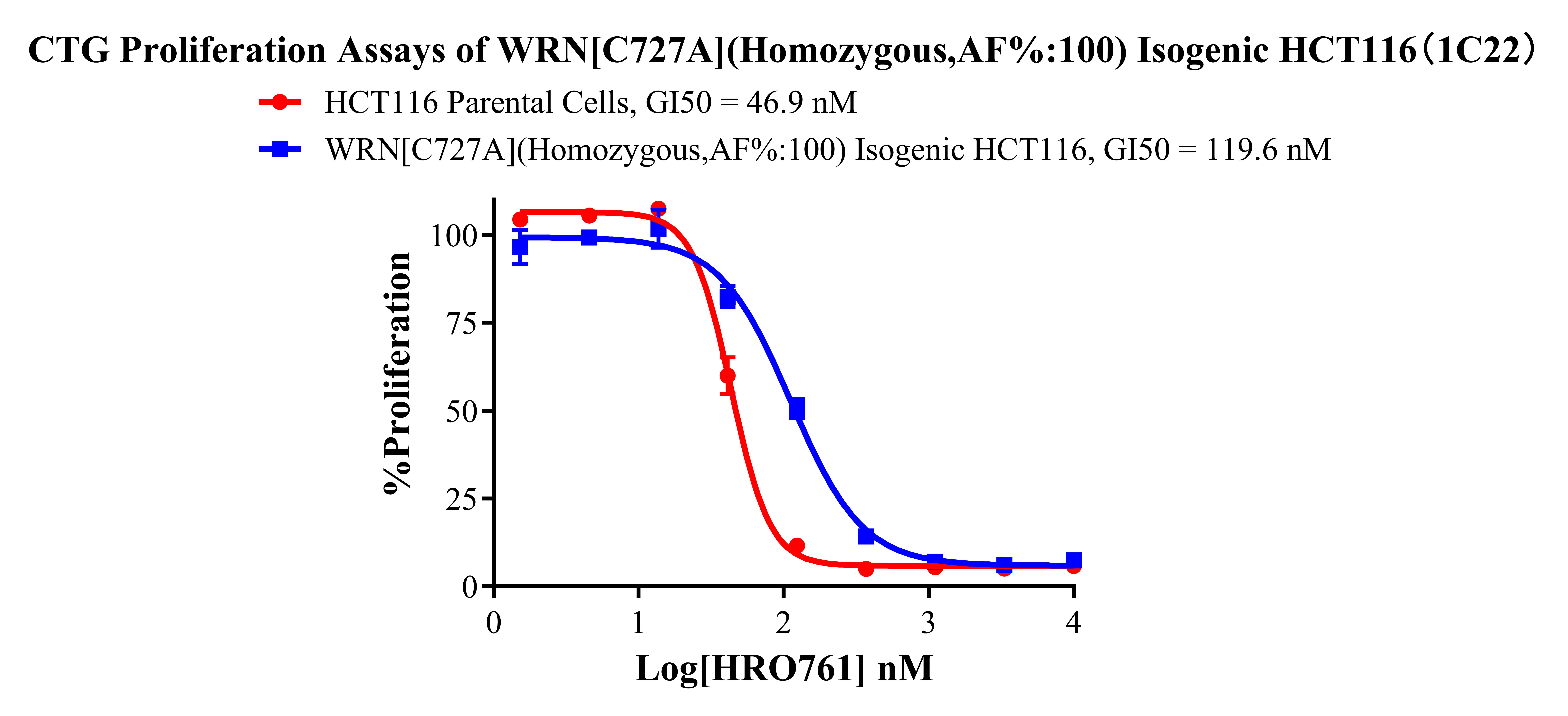WRN[C727A](Homozygous,AF%:100) Isogenic HCT116 藥靶細胞,通過 基因編輯的方式將 WRN 的 727 位氨基酸胱氨酸(C)突變?yōu)楸彼幔ˋ)。![]() Figure 1. WRN[C727A](Homozygous,AF%:100) Isogenic HCT116 原理示意圖 |