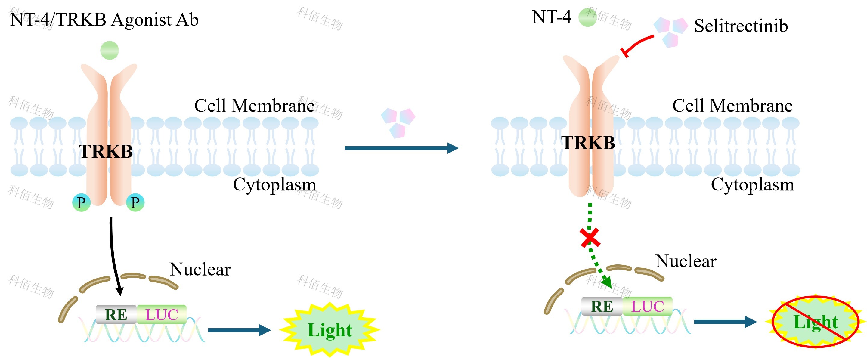 TRKB Effector Reporter Cell 報(bào)告基因藥靶模型很好的模擬了體內(nèi) TRKB 的信號(hào)轉(zhuǎn)導(dǎo)過程,原理見下圖所示。