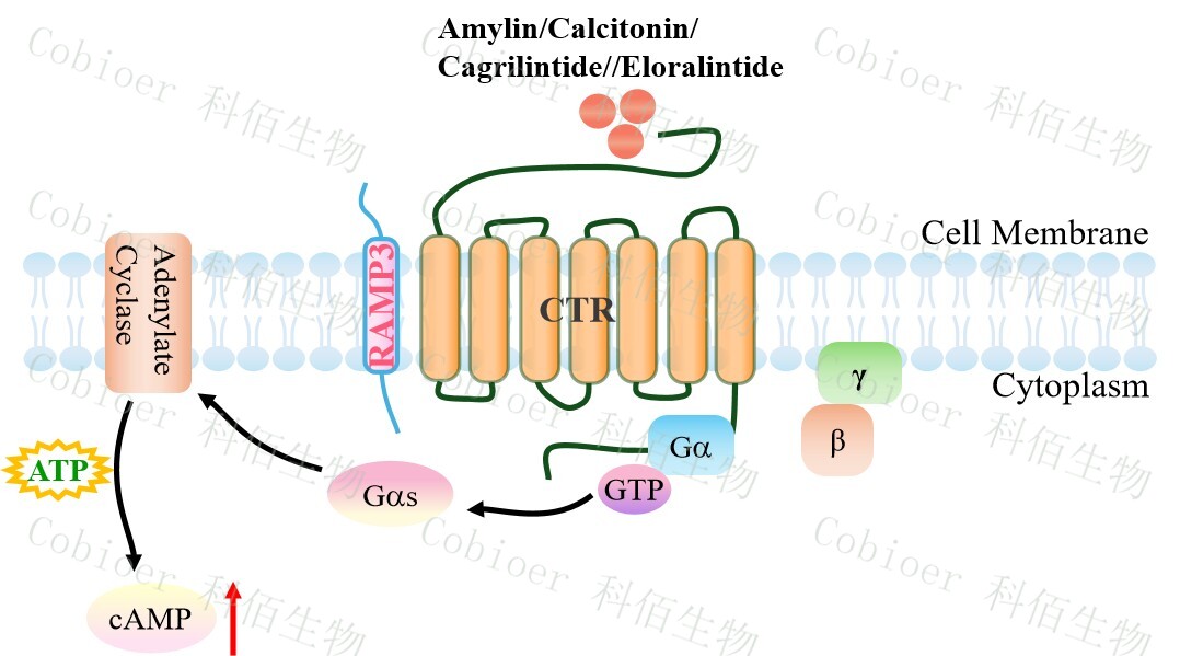 胰淀素(Amylin)受體的三種類型的已被確定,即 AMY1,AMY2 和 AMY3。胰淀素 受體屬于 B 類 GPCR,是異二聚體復合物,由降鈣素受體(CTR)與受體活性修飾蛋白 (RAMPs)結合形成。該受體的 CTR 組分具有相同的 GPCR 結構:7 個跨膜相互連接的α- 螺旋,將細胞外信號傳遞到細胞內細胞質信號級聯。RAMP 有三種類型(RAMP1、 RAMP2 和 RAMP3),它們共享 31%的氨基酸序列,具有相似的基本結構。RAMP 是將 CTR 轉運到細胞膜并調節(jié)其配體特異性的重要肽,它可以改變特定 GPCR 的藥理學、功能 和細胞運輸。