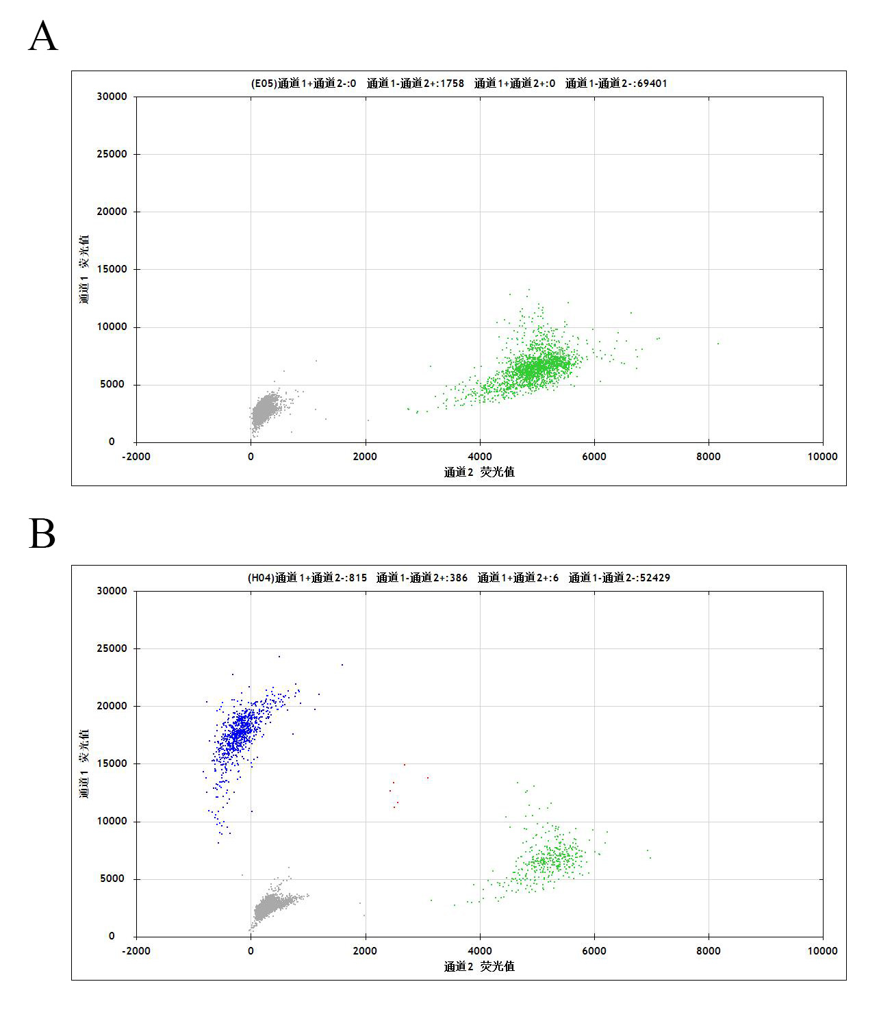 Figure 3. A: MCF7 Parental Cell;B:ESR1[Y537N](Heterozygous,AF%:66.7) Isogenic MCF7 通道2 藍(lán)色微滴代表ESR1[Y537N]突變陽性,通道2 綠色微滴代表該位點為陰性野生型