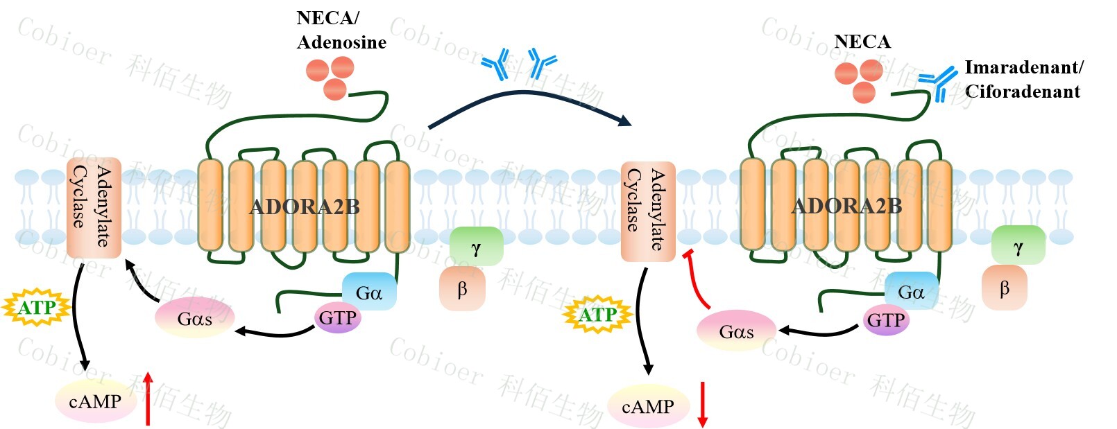 cAMP 在 G 蛋白偶聯(lián)受體(GPCR)信號轉(zhuǎn)導(dǎo)中是一種關(guān)鍵的第二信使。當(dāng)配體結(jié)合 到 GPCR,構(gòu)象發(fā)生變化,激活受體接著激活 G 蛋白,Gs 的激活導(dǎo)致腺苷酸環(huán)化酶調(diào)控 cAMP 的升高。 ADORA2B Gα15 CHO 細(xì)胞藥靶模型很好的模擬了體內(nèi) ADORA2B 的信號轉(zhuǎn)導(dǎo)過程,原理見下圖所示。