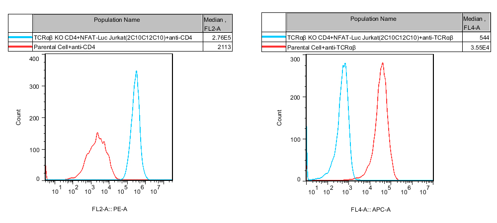 | TCRαβ KO CD4+ NFAT-Luc Jurkat 細(xì)胞,在 NFAT-Luc Jurkat 細(xì)胞上敲除 TCRαβ,表達(dá)CD4。 | |