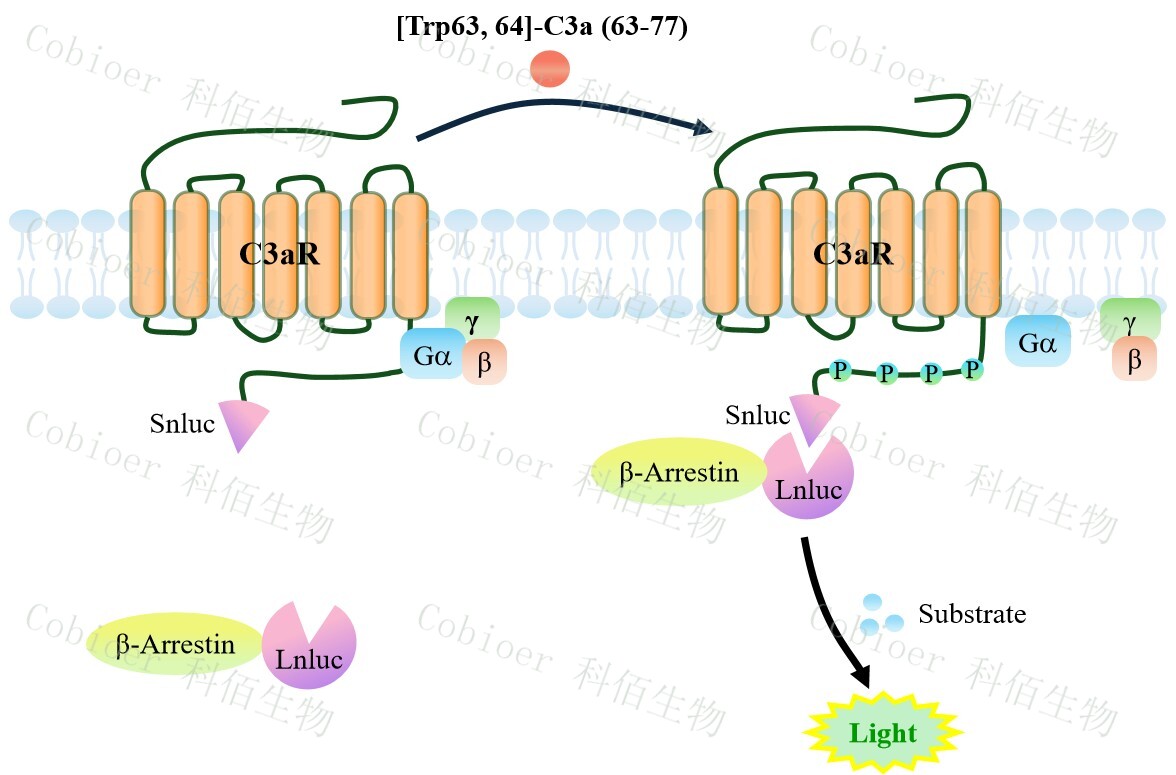 C3aR β-Arrestin CHO 報告基因藥靶模型很好的模擬了體內 C3aR/β-Arrestin 的信號轉導過程,原理見下圖所示。