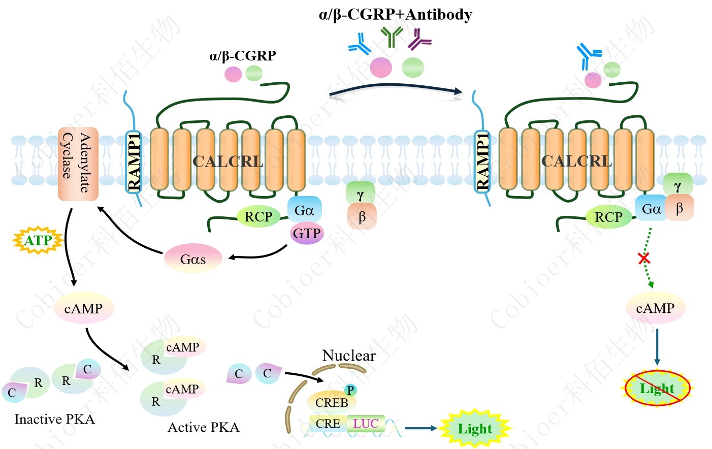 | 降鈣素基因相關(guān)肽(CGRP)家族包括 CGRP 本身、降鈣素(CT)、腎上腺髓質(zhì)素(AM)和 胰島淀粉樣肽(AMY)。 神經(jīng)肽降鈣素基因相關(guān)肽(CGRP)是中樞和外周神經(jīng)元產(chǎn)生的一種有效的血管擴張劑。 CGRP 在人體內(nèi)以α - CGRP 和β - CGRP 兩種形式存在。α - CGRP 和β - CGRP 都是受體的完 全激動劑。CGRP 通過 CGRP 受體介導(dǎo)其作用,CGRP 受體是一種異二聚體復(fù)合物:G 蛋 白偶聯(lián)受體 CALCRL 和單跨膜結(jié)構(gòu)域蛋白受體 RAMP1。功能 CGRP 受體所需的最后一個 成分是受體成分蛋白(RCP)。缺乏 RCP 已被證明會影響 CGRP 受體的激活,以環(huán)磷酸腺苷 (cAMP)的增加來衡量,而不影響配體的結(jié)合。受體的主要功能單元 CALCRL(也稱為 CLR 或 CRLR)可以連接到三種 RAMPs 中的一種,這三種 RAMPs 分別產(chǎn)生不同的受體。 RAMPs 是單跨膜蛋白,對受體功能至關(guān)重要,因為它們參與受體復(fù)合物向質(zhì)膜的易位,并 進一步提供配體結(jié)合的特異性。CALCRL 與 RAMP1 組成 CGRP 受體;RAMP2 是 AM 受 體,命名為 AM1;RAMP3 是 CGRP/AM 雙受體,命名為 AM2。RAMP1 亞基負責 CGRP 與 CGRP 受體的特異性結(jié)合。 配體結(jié)合后,復(fù)合物與 G 蛋白相互作用,Gαs 亞基從復(fù)合物中分離并激活腺苷酸環(huán)化 酶,產(chǎn)生 cAMP。細胞內(nèi) cAMP 濃度升高刺激 cAMP 依賴的信號通路,最終導(dǎo)致轉(zhuǎn)錄因子 cAMP 應(yīng)答元件結(jié)合蛋白(CREB)與 CRE 啟動子結(jié)合,誘導(dǎo)基因表達。 |