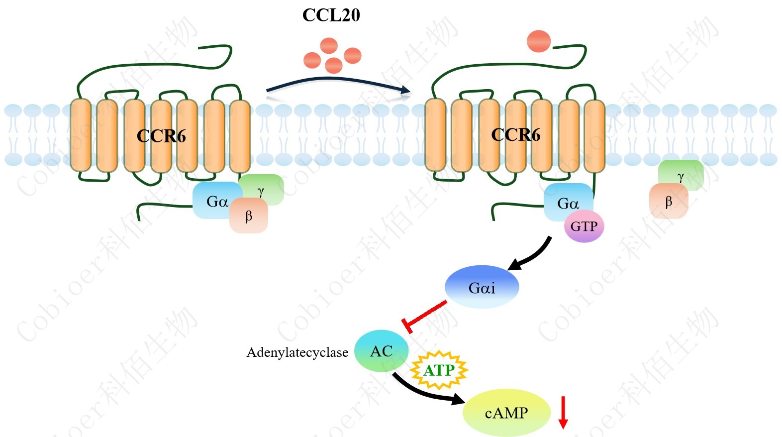 cAMP 在 G 蛋白偶聯(lián)受體(GPCR)信號轉(zhuǎn)導中是一種關(guān)鍵的第二信使。當配體結(jié)合到 GPCR,構(gòu)象發(fā)生變化,激活受體接著激活 G 蛋白,Gi 的激活導致腺苷酸環(huán)化酶調(diào)控 cAMP 的下調(diào)。CCR6 藥靶模型很好的模擬了體內(nèi) CCR6 的信號轉(zhuǎn)導過程,原理見下圖所示。![]() Figure 1. CCR6 CHO 細胞模型原理圖 |