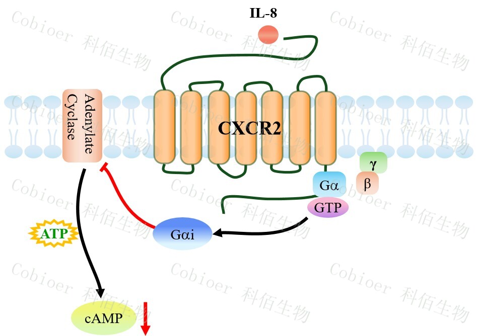 cAMP 在 G 蛋白偶聯(lián)受體(GPCR)信號轉導中是一種關鍵的第二信使。當配體結合 到 GPCR,構象發(fā)生變化,激活受體接著激活 G 蛋白,Gi 的激活導致腺苷酸環(huán)化酶調控 cAMP 的下調。CXCR2 CHO 藥靶模型很好的模擬了體內 CXCR2 的信號轉導過程,原理見 下圖所示。